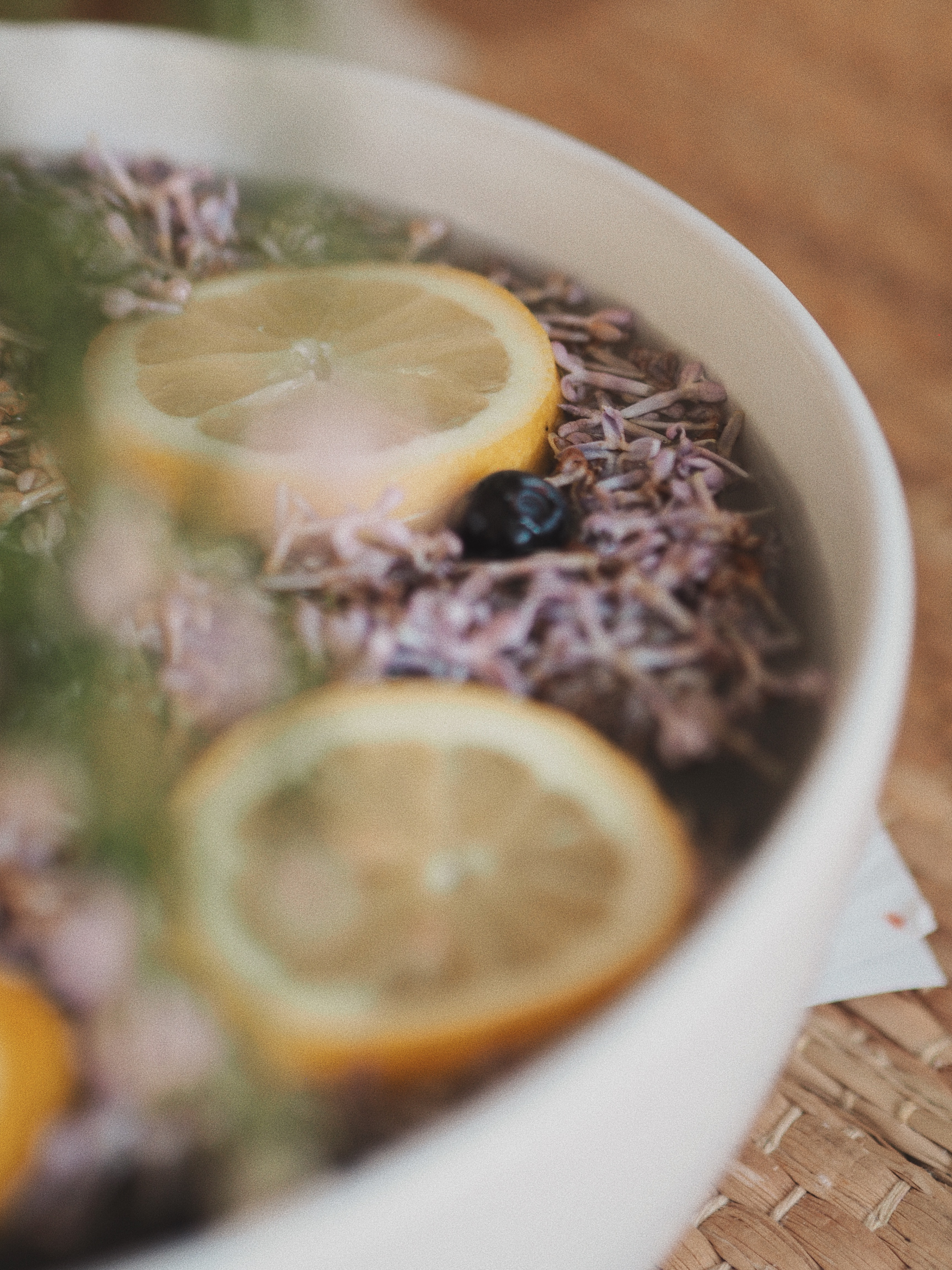 Kann durchaus etwas dauern, aber hat auch irgendwie meditative Züge. Ich habs geliebt, bei guter Musik oder nem Podcast die vielen kleinen Blüten von den Dolden zu zupfen und in eine große, hitzefeste Schüssel fallen zu lassen. Wenn ihr damit fertig seid, gerne schon mal die Zitrone in Scheiben schneiden und auf die Blüten legen. Für ein bisschen mehr Farbe – ich hatte recht helle Blüten – legt gerne ein paar Blaubeeren dazu, ist aber kein Muss.