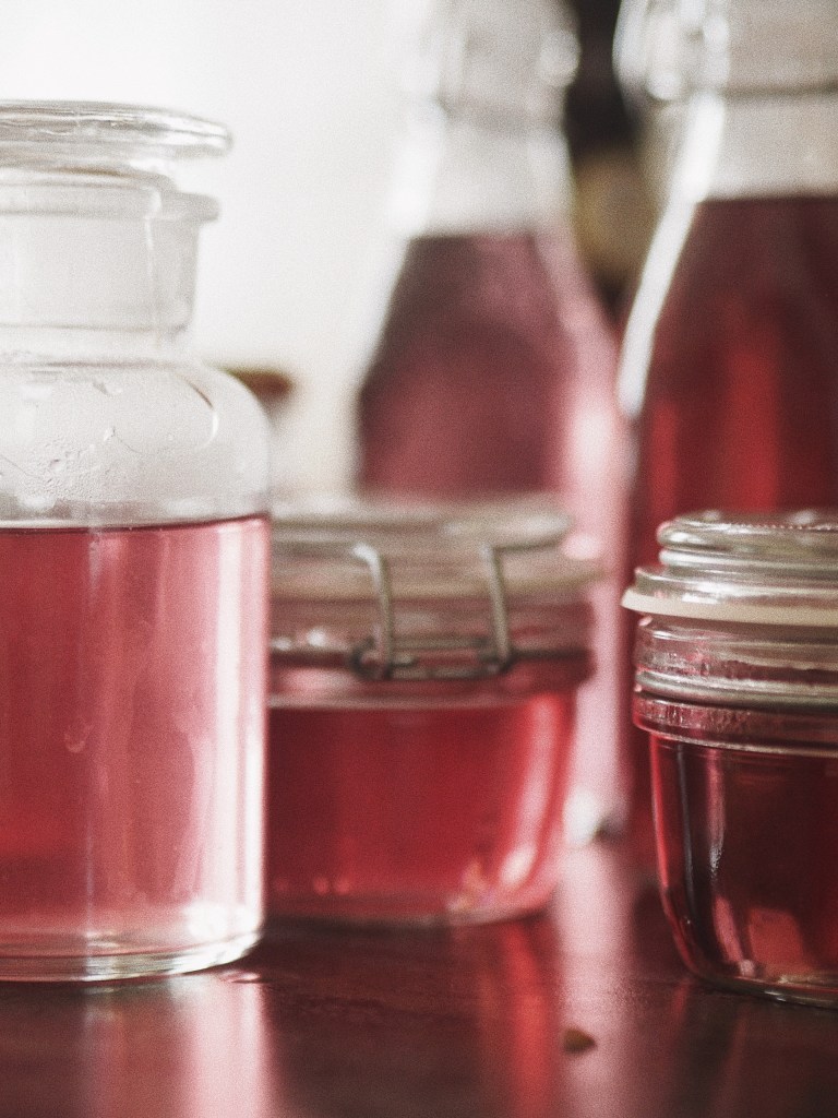 Nach den 4 langen Tagen kann der Sirup eeeendlich aus dem Kühlschrank und unbedingt durch ein Sieb nochmal in einen Topf gegossen werden, damit er nochmal aufgekocht wird. So kann er dann in saubere, hitzebeständige Flaschen / Gefäße umgefüllt und fest verschlossen werden. Nachdem die Flaschen abgekühlt sind, stelle ich sie für eine längere Haltbarkeit in den Kühlschrank.